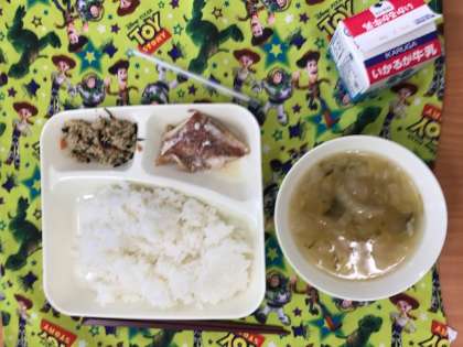 今日のメニューは「赤魚の醤油だれかけ・高野豆腐の炒り煮・薄くず汁・ご飯・牛乳」の5品です。