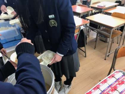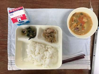 今日のメニューは「鶏肉のゆず塩焼き・小松菜の煮びたし・さつまいもの味噌汁・ご飯・牛乳」の5品です。