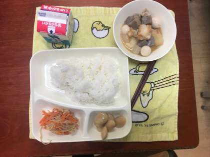 1・3年生の昼食は学校給食です。メニューは「関東煮・もやしと人参の甘酢和え・白花豆の煮もの・ご飯・牛乳」の5品です。