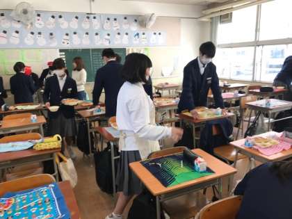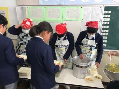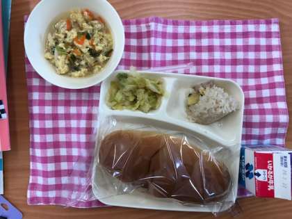 今日のメニューは「中華おこわ・キャベツのオイスターソース炒め・卵スープ・おさつパン・牛乳」の5品です。