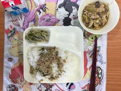 今日のメニューは「すき焼き煮・ツナっ葉炒め・ご飯・もやしときゅうりの生姜漬け・牛乳」の5品です。