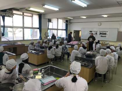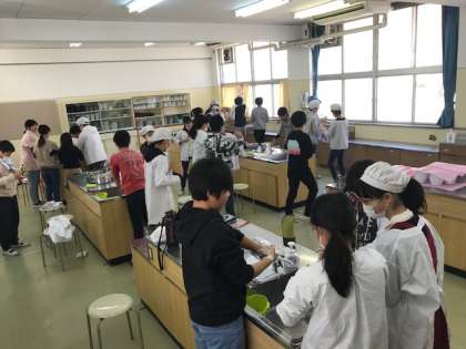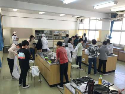 東井高野小学校の調理室が工事で使えない、ということで中学校の調理室で家庭科の調理実習をしました。