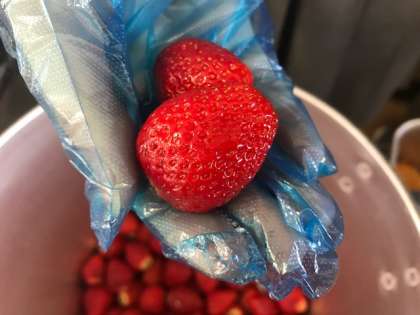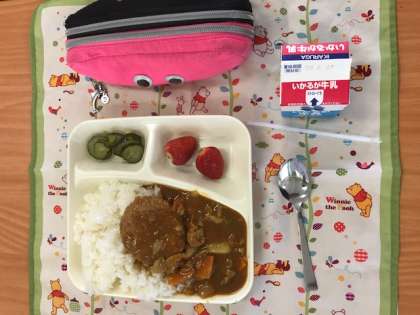今日のメニューは「ポークカレー・ご飯・チキンレバーカツ・胡瓜とコーンのサラダ・いちご・牛乳」とすると6品です。