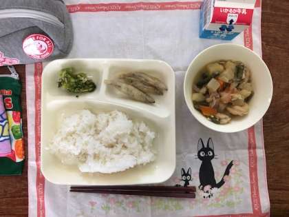 今日のメニューは「きびなごの天ぷら・一口がんもとじゃがいもの煮もの・ブロッコリーの胡麻和え・ご飯・牛乳」の5品です。