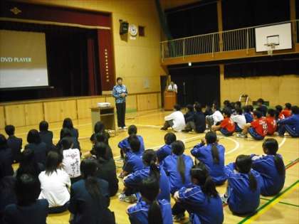11月12日(水)の放課後、大阪市のトップアスリート「夢・授業」が本校で開催されました。講師は、中学生の時から全日本入りし、エースアタッカーとしてロサンゼルスオリンピックで銅メダルを獲得した大谷佐知子さんです。前半は各部の部長と男女バレーボール部が、大谷さんの紹介映像を視聴し、講話を聞きました。後半は男女バレーボールが大谷さんのきめ細かくわかりやすい指導を受けました。予定時間を40分も超える熱い指導に子どもたちはどんどん引き込まれ、目を輝かせていました。