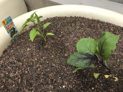 4つのプランターに胡瓜・ピーマン・コーン・トマトの苗を植えました。
