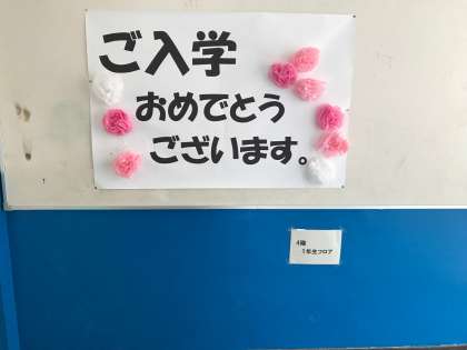 「コ」の字の西側トイレの横は階段になっていて上りきると1年の先生が作ったお祝いのデコレーションが飾ってあります。