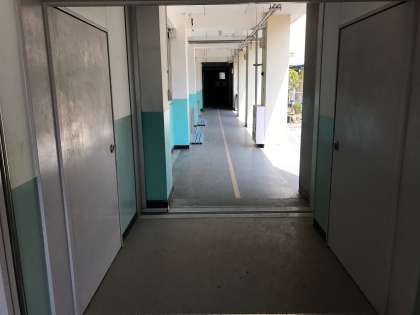 1階のエレベーターホールです。夏の熱中症対策アイテムの「ミスト付き扇風機」が置いてあります。