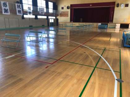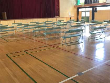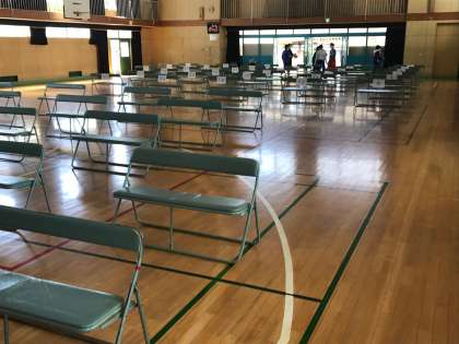 明日から登校日なので、出勤している先生で会場を設営しました。