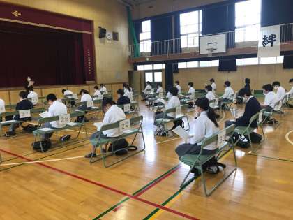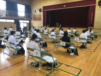 入口側で2年3組が学活をしているので、先生の声が錯綜(さくそう)しますが、しっかりと目と耳で話を聞いていました。