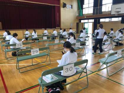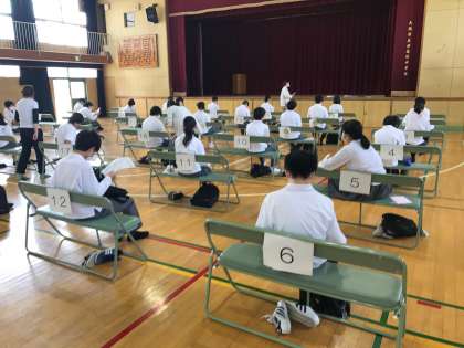 今までなら、列の先頭の人に人数分を渡して後ろに回してもらっていましたが、感染症予防の観点から、先生が一人ずつ手渡ししています。