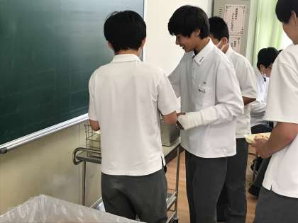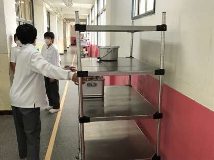 食事が終わると各自でお皿などを片付け、係の人が食缶やお皿のかごなどを台車にのせて、今日の給食、予定終了でございます。