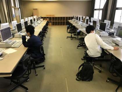 男子2人がパソコンに向かい、マウスを動かしながらカチカチしています。