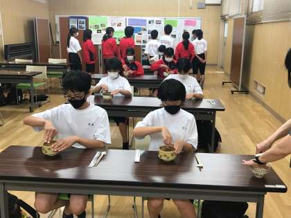 後ろでは掲示物を見ながら茶道部の校外での活動の様子を教えてもらっています。
