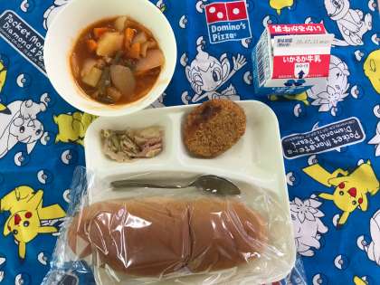 今日のメニューは「チキンレバーカツ・ケチャップ煮・たことキャベツのバジルソテー・黒糖パン・牛乳」の5品です。