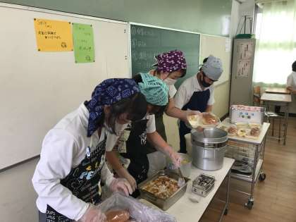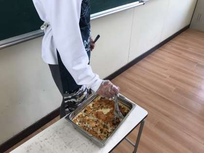 2年生給食当番のグラタンの切り方の手際よさ、盛り付けの流れ作業の美しさが半端ありません。