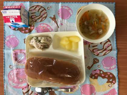 今日のメニューは「マカロニグラタン・スープ・大型コッペパン(いちごジャムを添えて)・りんご(カット缶)・牛乳」の5品です。