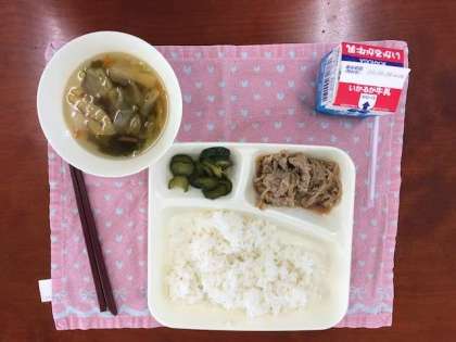 今日のメニューは「豚肉のごまだれ焼き・五目汁・胡瓜のおかかあえ・ご飯・牛乳」の5品です。