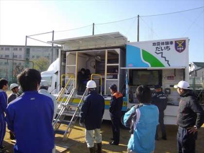 体験活動では、全学年を町会毎の班に分けて3つの体験をしました。起震車による震度体験、煙中体験、水消火器体験に取り組みました。消防署の方から説明をしていただき、地域防災リーダーの指導のもと生徒たちは熱心に取組んでいました。