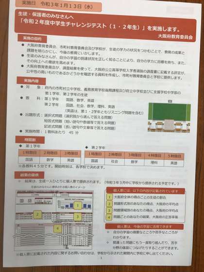 1年生のチャレンジテストは国・数・英の3科目ですが、同じ日に大阪市のチャレンジテストplusとして社会・理科を実施します。