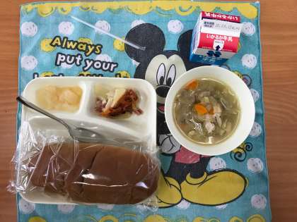 今日のメニューは「鶏肉とてぼ豆のスープ煮・じゃがいもとトマトのチーズ焼き・和梨「(カット缶)・黒糖パン・牛乳」の5品です。