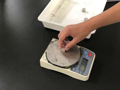 まず、電子天秤(てんびん)で物質の重さを測ります。