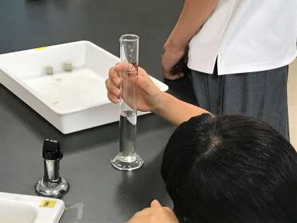 続いて物質を1つメスシリンダーに入れ、その体積Bを読み取ります。