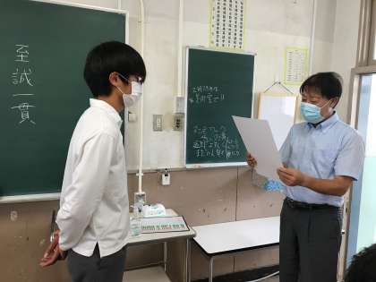 陸上競技部H選手への賞状授与を教室で行いました。