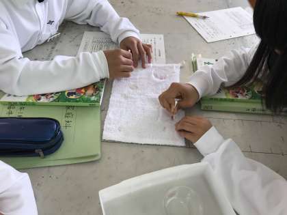「しみ抜き」の実験をしています。