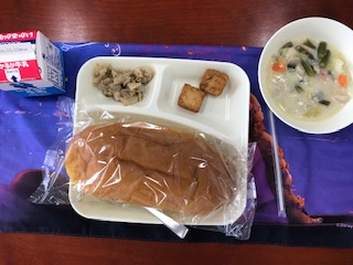 今日のメニューは「厚揚げのピリ辛醤油かけ・豚肉と蓮根のオイスターソース・白菜のクリーム煮・パンプキンパン・牛乳」の5品です。