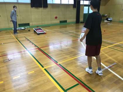 大きめのお手玉を投げてホールに入れると3点です。