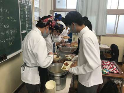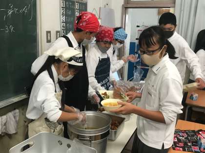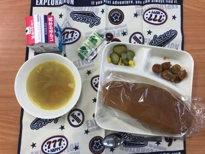 今日のメニューは「鮪(まぐろ)のオーロラ煮・きゅうりとコーンのゆずドレッシング・ベーコンとじゃがいものスープ・コッペパン(ソフトマーガリンを添えて)・牛乳」の5品です。