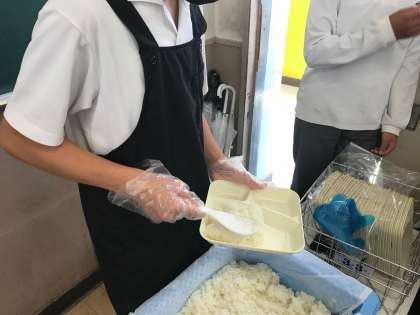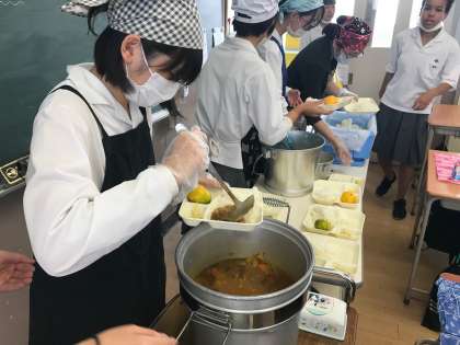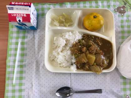 今日のメニューは「ポークカレーライス(ご飯)・白菜のピクルス・みかん・牛乳」の4品です。