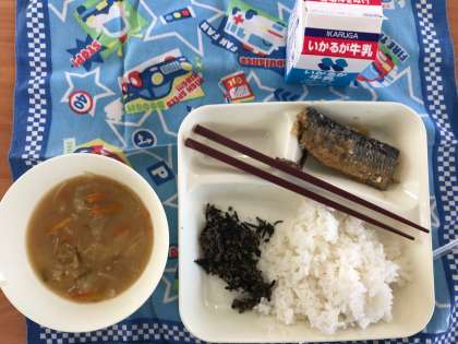 今日のメニューは「秋刀魚(さんま)のみぞれかけ・味噌汁・牛ひじきそぼろ・ご飯・牛乳」の5品です。