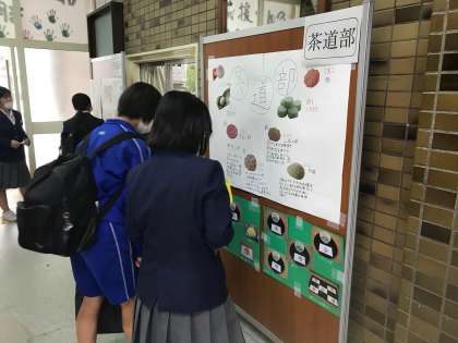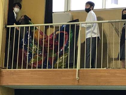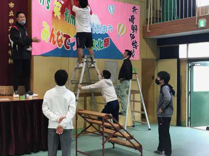 写真上)特大スローガンは脚立(きゃたつ)に乗るので、先生がやります。