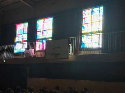 1年生各クラスの個性が詰まった作品を大きなステンドグラスにしました。