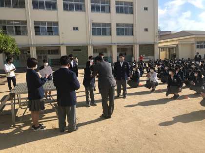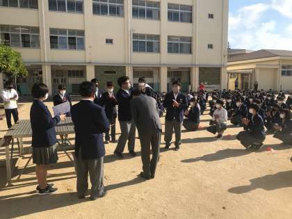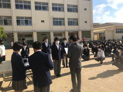 新生徒会役員の皆さんと各学年1組の男子学級代表の人に認証状を渡しました。