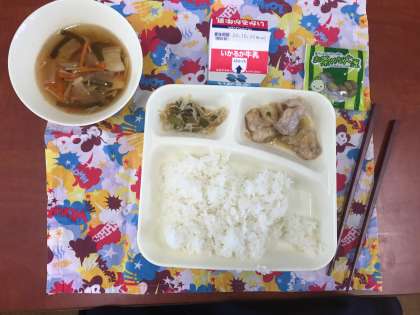 今日のメニューは「鶏肉のゆず塩焼き・もやしと三度豆の甘酢和え・ソーキ汁・抹茶大豆・牛乳」の6品です。