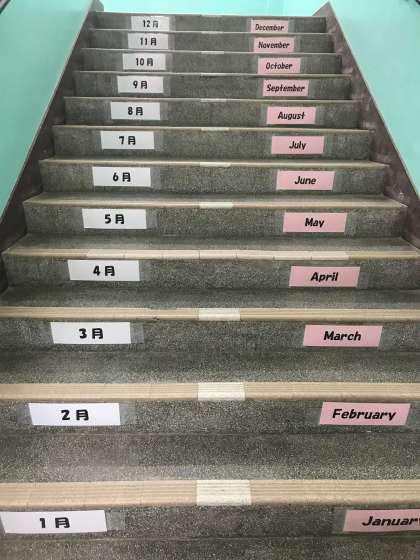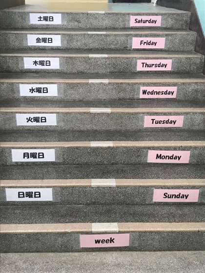 西階段の蹴込(けこみ)にも英単語が貼られています。