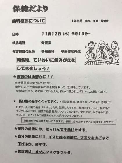 12日(木)1限から歯科校医の先生に来ていただいて3年生の歯科検診を実施します。