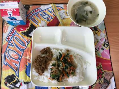 今日のメニューは「ドライカレービビンバ(ご飯)・トック・牛乳」の3品です。