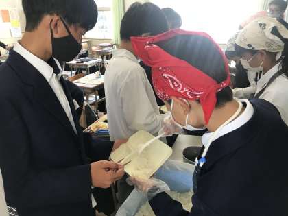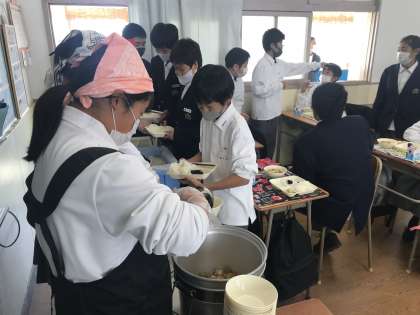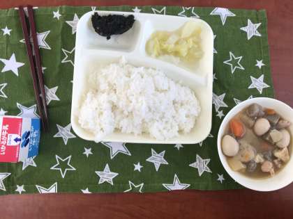 今日のメニューは「関東煮・白菜の甘酢和え・海苔の佃煮・ご飯・牛乳」の5品です。