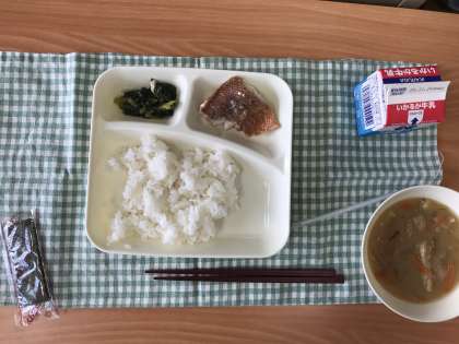 今日のメニューは「あかうおの醤油だれかけ・味噌汁・小松菜の炒め物・焼き海苔・ご飯・牛乳」の6品です。