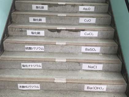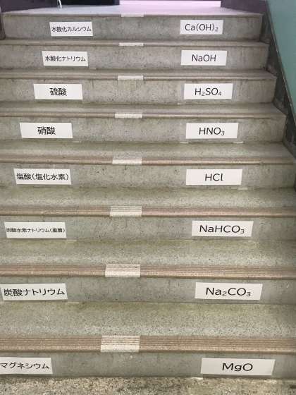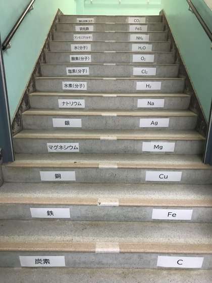 東階段の蹴込部分のカードが「英語で数字」から元素名・化学物質名・元素記号・化学式にリニューアル&バージョンアップされました。