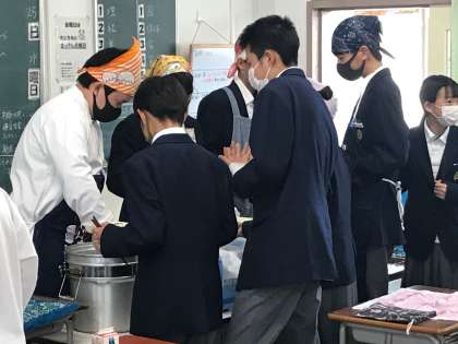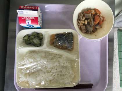 今日のメニューは「さごしのおろし醤油かけ・キュウリのしょうが漬け・大豆と冬野菜の煮物・ご飯・牛乳」の5品です。