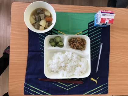 今日のメニューは「鶏肉と野菜の煮物・じゃこ豆・あっさりきゅうり・ご飯・牛乳」の5品です。