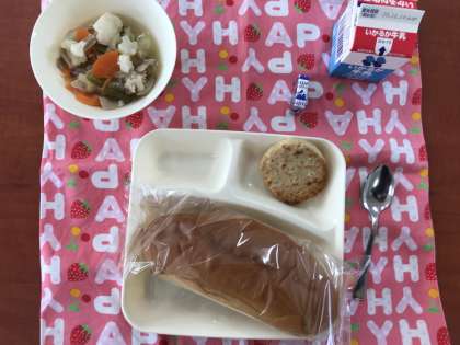 今日のメニューは「豆腐ハンバーグ(ケチャップを添えて)・カリフラワーのスープ煮・固形チーズ・黒糖パン・牛乳」の5品です。