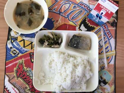今日のメニューは「鯖(さば)の霙(みぞれ)かけ・小松菜のお浸(ひた)し・味噌汁・ご飯・牛乳」の5品です。