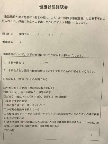 〇健康状態確認書のご記入と担任へのご提出をお願いします。