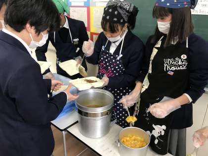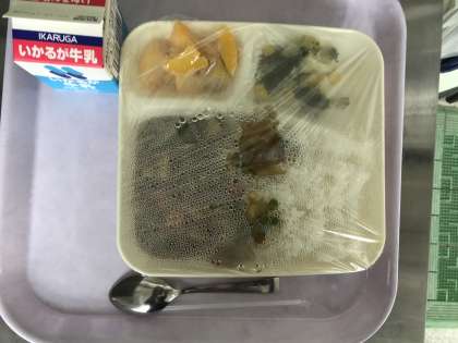 今日のメニューは「冬野菜のカレーライス(ご飯)・ブロッコリーとコーンのサラダ・黄桃(カット缶)・牛乳」の4品です。